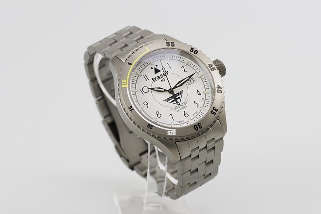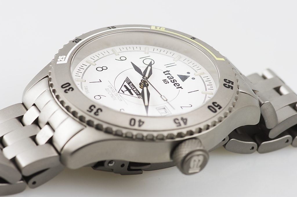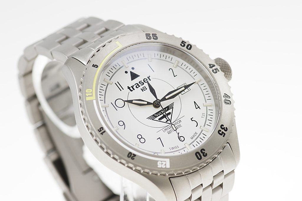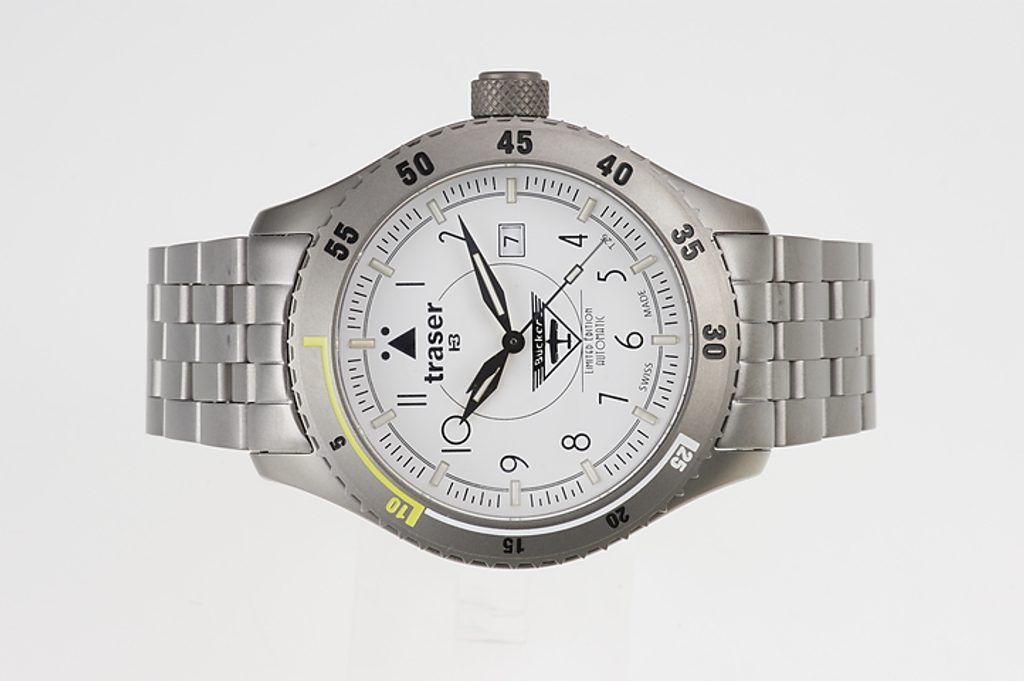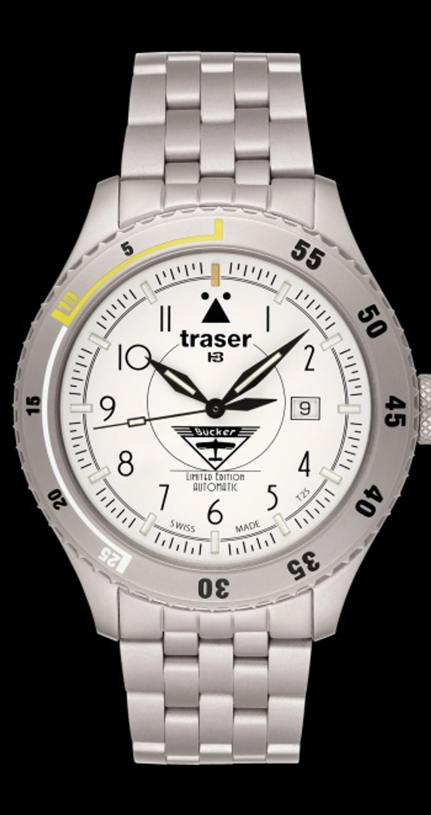 Hodinky Traser Bücker Automatic Titan White byly vyrobeny v limitované edici pouhých 200 ks! Zaujmou hlavně mechanickým strojkem s automatickým nátahem, konvexním safírovým sklíčkem a velmi robustním, titanovým pouzdrem. Další zajímavostí je oboustranně otočná titanová luneta a průhled dýnkem na strojek. Na výběr je ze dvou druhů pásků: titanový a kožený.
